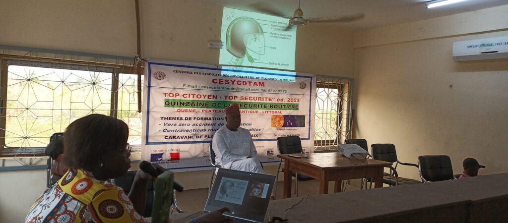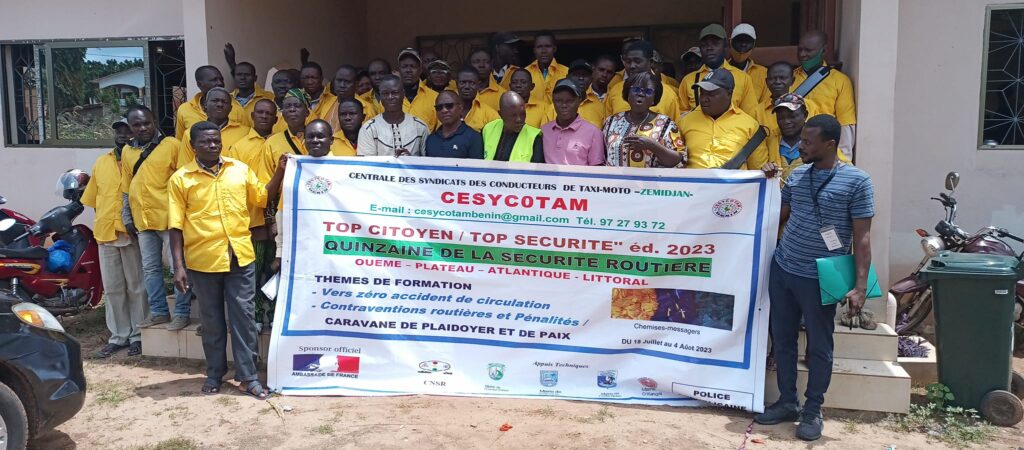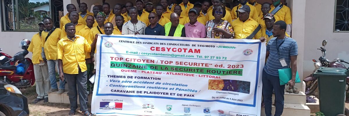 Top citoyen / Top sécurité Édition 2023: quinzaine de la sécurité routière au Bénin, du 18 juillet au 4 août 2023. Cérémonie officielle de lancement, au siège national des zemidjan à Porto-Novo. Ouémé, plateau, Atlantique et littoral sont les quatre départements retenus pour bénéficier de ce programme qui prend en compte 1500 zemidjan participants. Le Centre National de la Sécurité Routière CNSR et Police Républicaine sont retenus pour délivrer les formations sur les thèmes retenus :